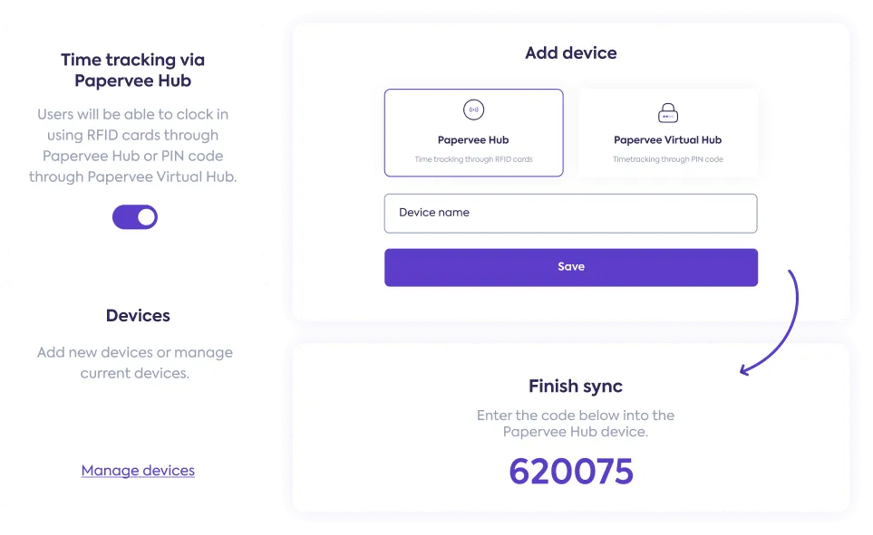 To add and sync the device to your Papervee account, navigate to Settings > Papervee Hub in Papervee and activate time tracking via Papervee Hub. You can add the device using the 'Manage Equipment' button.