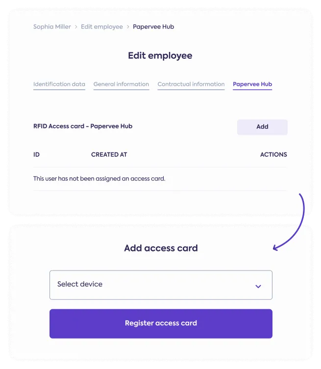 To register your employees' cards, navigate to Employees > Edit Employee > Papervee Hub and click the Add button in the RFID card section.